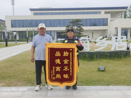 5月25日,宿遷市神盾保安服務(wù)有限公司駐朱海康養(yǎng)旅游度假區(qū)保安員陳海玲巡邏期間,在云海鄉(xiāng)居碼頭撿拾手機(jī)一部,經(jīng)多方聯(lián)系歸還失主,后失主贈(zèng)送錦旗表示感謝。